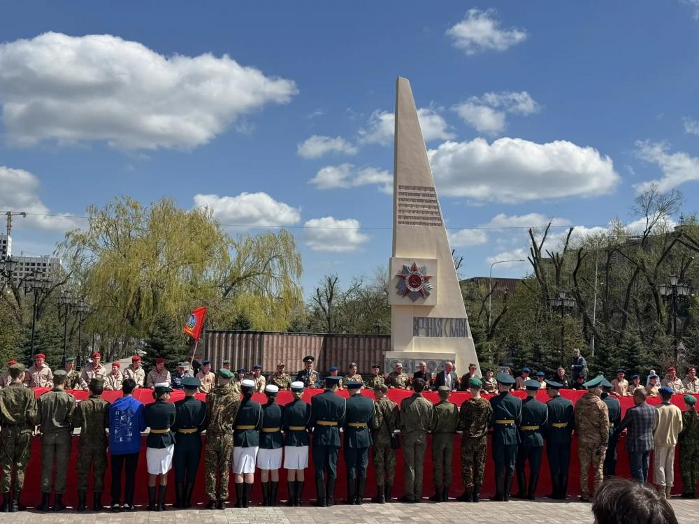 На площади перед обелиском «Вечная Слава» наши ребята вместе с другими горожанами встретили участников пробега. Самым трепетным моментом стал разворот огромной копии Знамени Победы — символа единства и несокрушимой воли нашего народа.