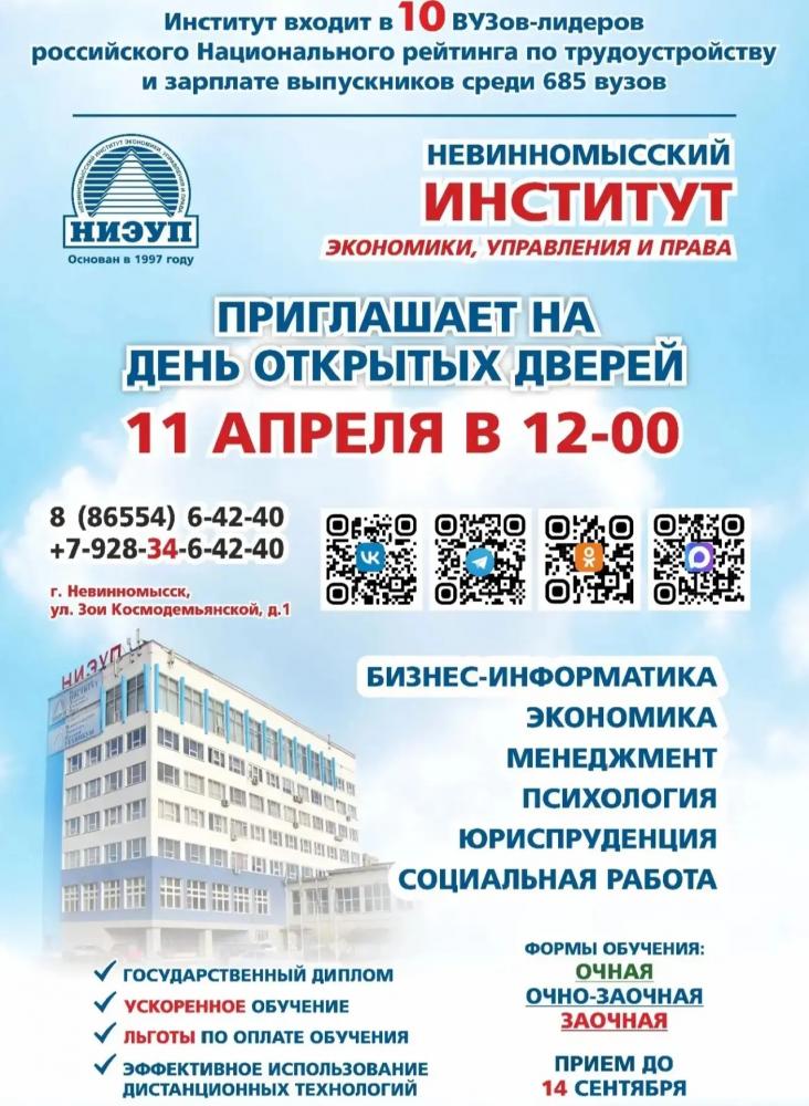 Уважаемые абитуриенты и их родители, приглашаем вас на День открытых дверей, который состоится 11 апреля в 12-00 по адресу: Невинномысск, ул. Зои Космодемьянской, д.1